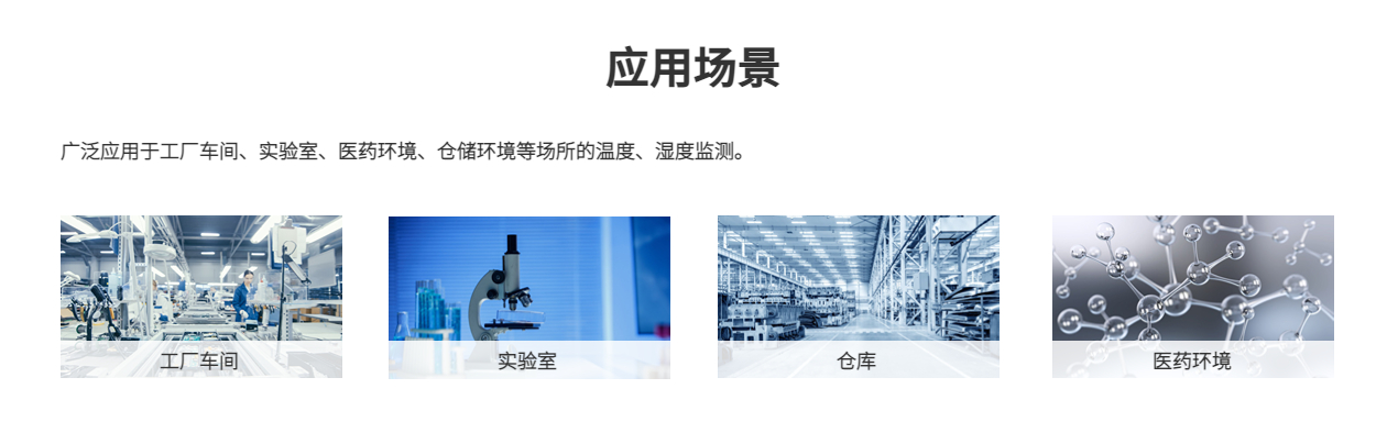 工廠車間、實驗室、醫藥環境、倉儲環境等場所的溫度、濕度監測。