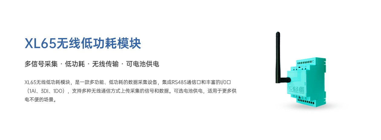XL65無線低功耗模塊,是一款多功能、低功耗的數(shù)據(jù)采集設(shè)備,集成RS485通信口和豐富的I/0口(1AI、3DI、1DO),支持多種無線通信方式上傳采集的信號(hào)和數(shù)據(jù)。可選電池供電,適用于更多供電不便的場景。