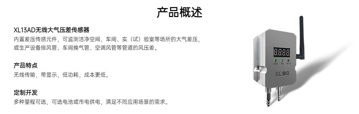 XL13AD智能壓差傳感器,按低功耗、電池供電標(biāo)準(zhǔn)設(shè)計(jì),帶顯示,多種量程可選,體積小,安裝接線簡(jiǎn)單、便捷,適應(yīng)不同的場(chǎng)景的需求。