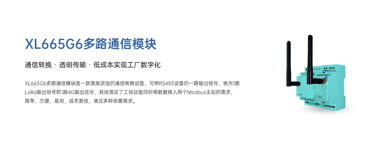 XL665G6多路通信模塊是一款高效靈活的通信轉換設備,可將RS485設備的一路輸出信號,轉為1路LoRa輸出信號和1路4G輸出信號,有效滿足了工控設備同時將數據接入兩個Modbus主站的需求,簡單、方便、易用,成本更低,滿足多種場景需求。