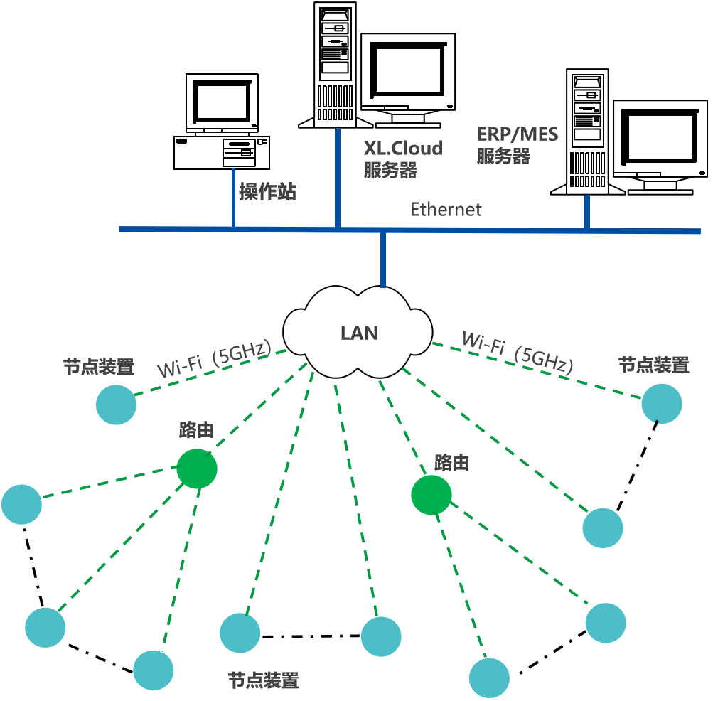 節(jié)點裝置(智能采集裝置/智能采集終端),通過Wi-Fi(5GHz),接入企業(yè)內(nèi)部LAN,推送設備生產(chǎn)數(shù)據(jù),至企業(yè)生產(chǎn)監(jiān)控平臺