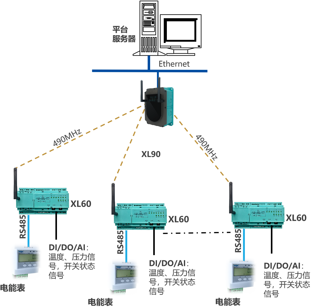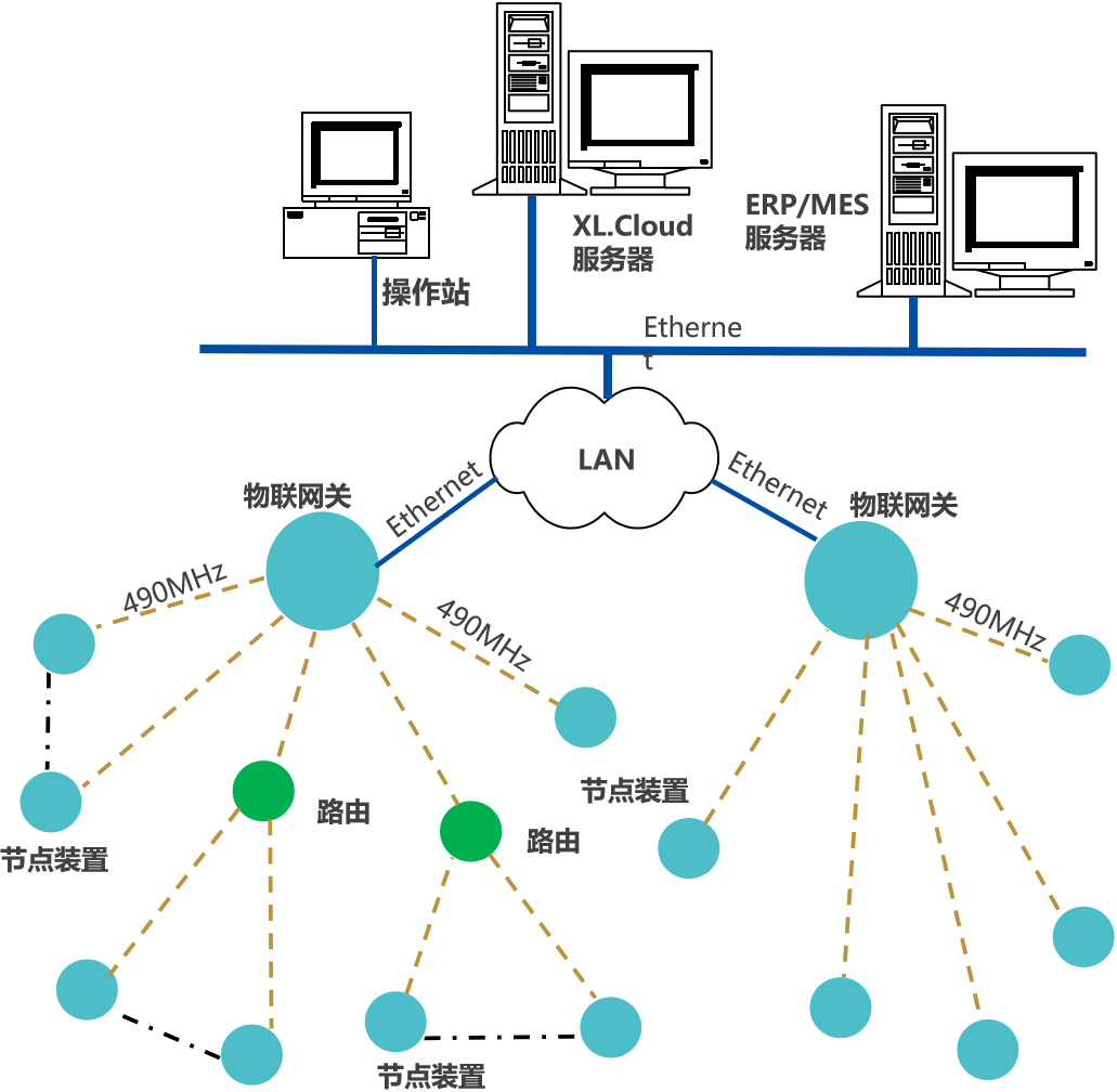 節(jié)點裝置(智能采集裝置/智能采集終端),通過490MHz上傳數(shù)據(jù)至物聯(lián)網(wǎng)關,網(wǎng)關通過Ethernet接入企業(yè)內(nèi)部LAN,推送設備生產(chǎn)數(shù)據(jù),至企業(yè)生產(chǎn)監(jiān)控平臺