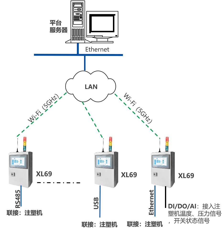 XL69智能采集終端,是系統(tǒng)的核心裝置,對采集的信號、數(shù)據(jù),進行處理、統(tǒng)計、計算,并生成單機設備的數(shù)據(jù)庫,通過企業(yè)內(nèi)部LAN,推送數(shù)據(jù)至企業(yè)生產(chǎn)監(jiān)控平臺