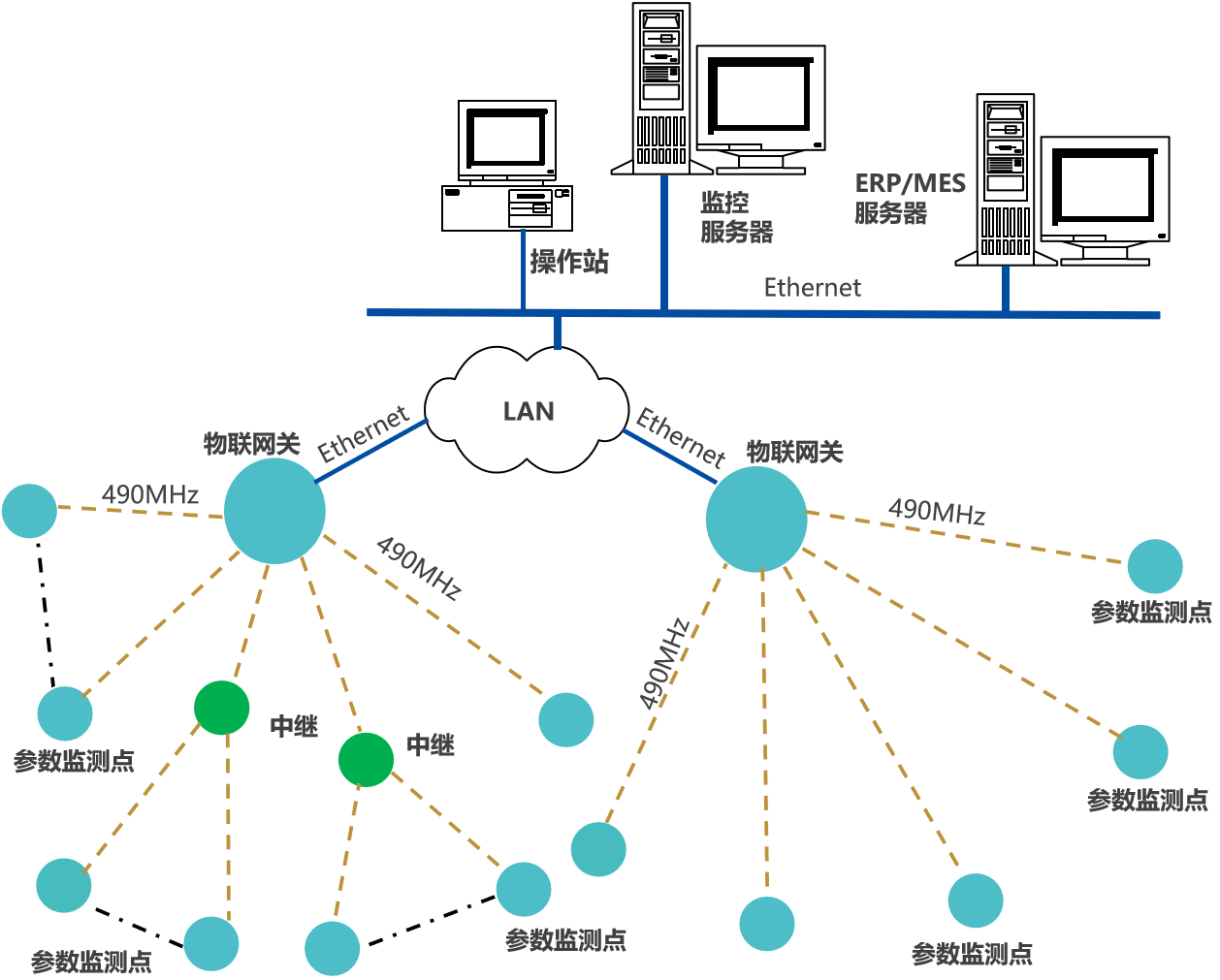 系統網絡方案一,用于工廠,或規模較小的園區,水、汽、氣管網監測系統。由監測節點、網關和平臺軟件構成