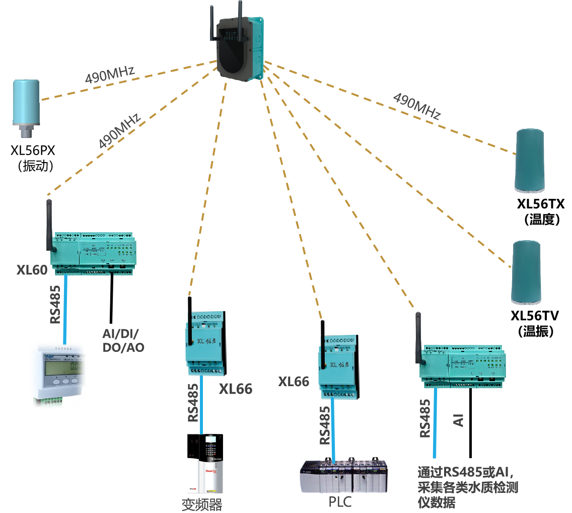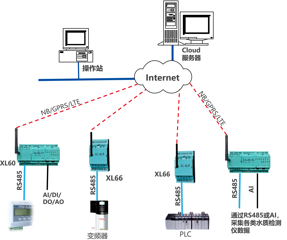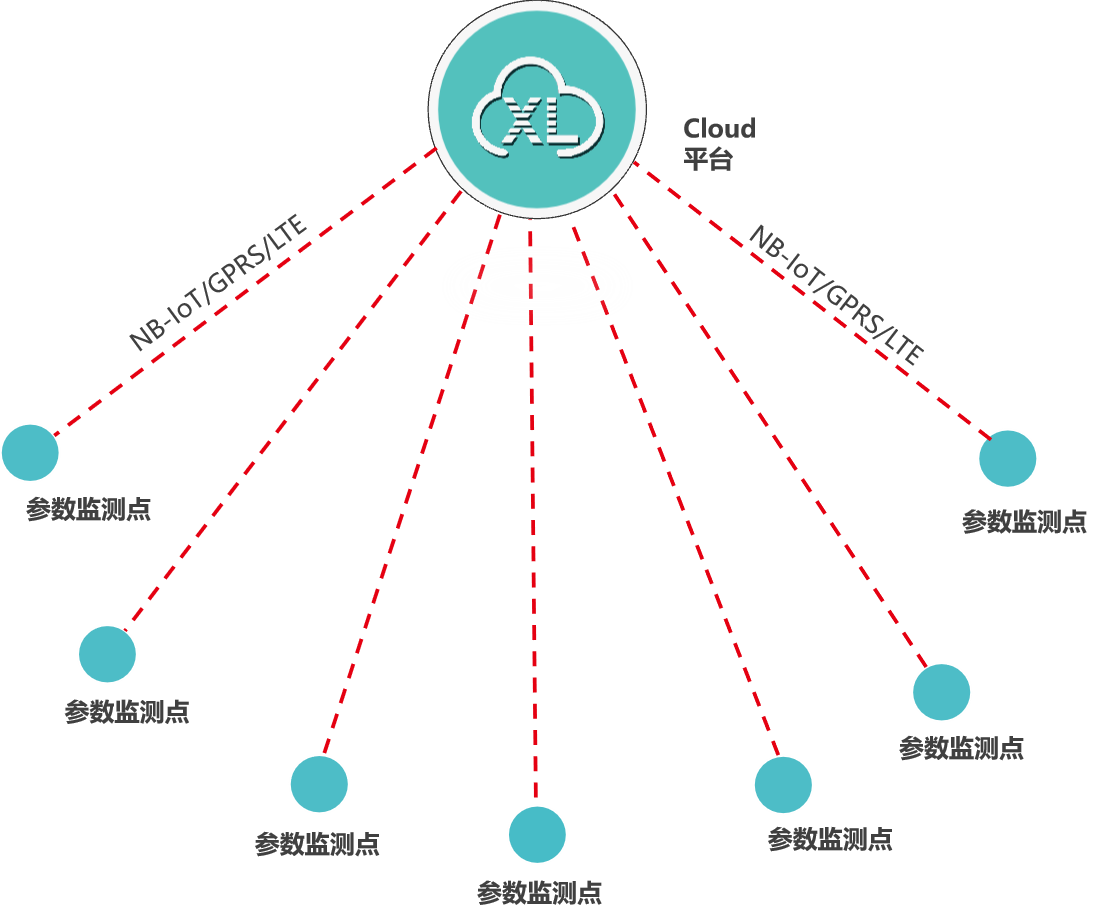 類似泵房、水廠、水源井等場所的數據監測,監測點的數據先上傳至XL90物聯網關,再通過NB/GPRS/LTE轉發數據至云平臺,此種情況,數以后在量大時,可選LTE(4g)方式