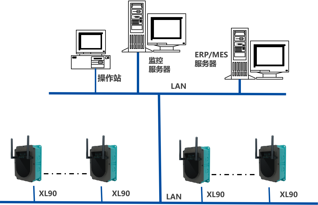 XIoT管網監控管理系統平臺,由1套XL.Cloud軟件、平臺監控服務器構成;通信網絡由多臺XL90物聯網關,及LAN構成,或是用Internet作為通信網絡