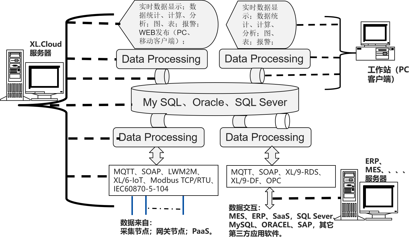 支持MQTT、LWM2M、SOAP,XL/6-IoT、XL/9-DB、XL/9-RDS,等等通信協議,并可和第三方數據庫,Oracle、SAP等交換數據