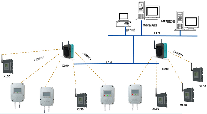 采集節點,通過490MHz無線上傳數據至物聯網關,網關通過Ethernet,接入LAN,推送數據至MES服務器
