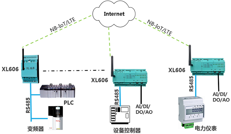 選擇XL60主機模塊,加I/O模塊,采集環保設備的運行信號;通過RS485/Ethernet接口,從機器控制器、PLC讀取設備運行數據;通過NB/4G上傳數據到平臺,4G網絡信號更穩定;