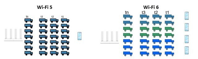 我們可以將路由器向設備傳輸的場景比喻成一個車隊,在WiF i5標準下,同一時刻出發車隊只能派送到一個客戶,即使有空車也照常發車,如果有車出現故障(受干擾),整個車隊都無法發車。而在WiFi 6標準下,同一時刻出發的一個車隊,可以將相鄰的最少26輛車組成一個小隊,每個小隊可以派送到不同的客戶,如果有車出現故障(受干擾)只影響所在的小隊。
