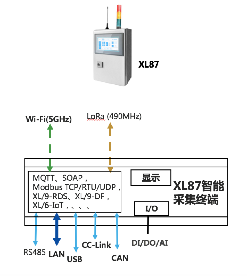 XL87智能采集終端,配置有 DI/AI/DO/AO,Ethernet,LoRa(無線),RS485、CAN、USB等等接口,通過各種功能的傳感器,采集設備運行工藝數據;