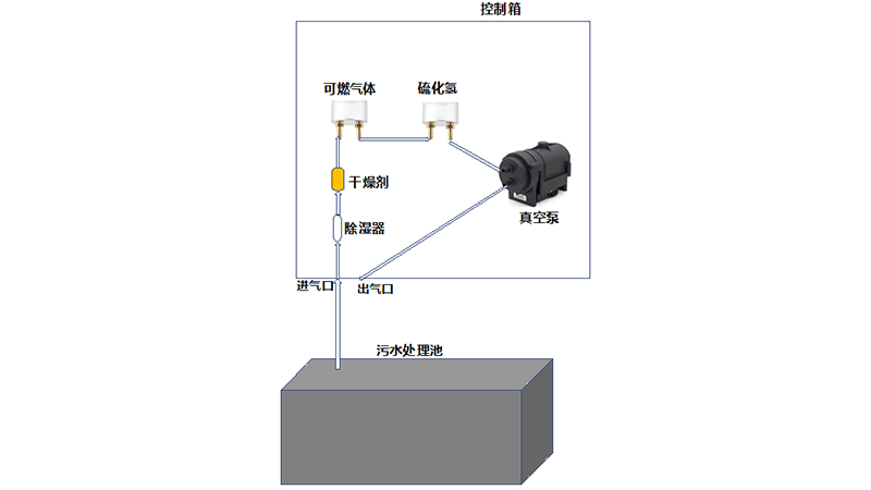 過(guò)程:用聚四氟乙烯管,聯(lián)接整個(gè)氣體通路。管直接伸入污水池,聯(lián)接控制箱進(jìn)氣口,氣體從進(jìn)氣口,至過(guò)濾器、除濕器,至傳感器探頭進(jìn)、出氣口(兩臺(tái)傳感器的進(jìn)、出氣口串聯(lián)),至真空泵抽氣口,從真空泵排氣口聯(lián)接控制箱出氣口;