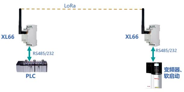 對于任意2臺帶RS485、232通信接口的設(shè)備,可分別與一臺XL66通過其RS485、232通信接口連接,其數(shù)據(jù)通過這2兩臺XL66,以無線通信方式實現(xiàn)數(shù)據(jù)透傳,從而免去現(xiàn)場繁雜的施工布線。