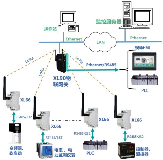 帶RS485或232通信接口的控制器、二次儀表、變送器等設(shè)備,通過通信接口與XL66連接,XL66通過LoRa無線通信方式將數(shù)據(jù)上傳至XL90或XL95物聯(lián)網(wǎng)關(guān),網(wǎng)關(guān)通過以太網(wǎng)或RS485,上傳數(shù)據(jù)至監(jiān)控平臺、PLC、觸摸屏、控制器等設(shè)備。從而實現(xiàn)有線串口設(shè)備的無線聯(lián)網(wǎng)。