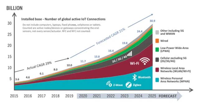 蜂窩通信是一個由電信運營商部署且覆蓋范圍廣、可靠性和安全性都很高的無線網絡,用戶無需再建一個全新的網絡來連接物聯網項目中的各種設備。蜂窩連接通常是高度移動的物聯網系統的理想選擇。隨著5G的大規模部署,跨廣域連接的物聯網設備(也稱為“大規模物聯網”,massive IoT)將成為現實,將跨廣域連接數千個物聯網設備。高數據速率蜂窩連接是數據密集型物聯網應用、高速移動設備和實時視頻流的完美選擇。在超大規模蜂窩物聯網白皮書中給出了這樣一組數據,到2026年底,蜂窩物聯網僅占所有連接的22%,算下來約有59億設備將通過蜂窩網絡實現連接。原因也很明顯,即:雖然蜂窩網絡能夠發送大量數據,尤其是4G和5G網絡,但對于許多應用來說,它的成本和功耗太高了。