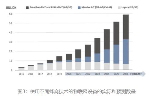3:使用不同蜂窩技術的物聯網設備的實際和預測數量