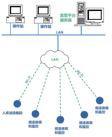 設計油漆調和監管系統,由監管平臺服務器、油漆調和操作監控終端、電子枰、油漆編碼終端、操作站等構成,通過工廠內的局域網(WI-FI)進行通信連接。