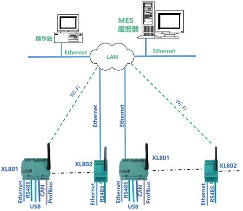 XL80通信主機,從設備通信接口,讀取設備或系統的運行數據,通信協議轉換處理后,再通過EthernetWi-Fi,接入LAN,轉發數據至MES