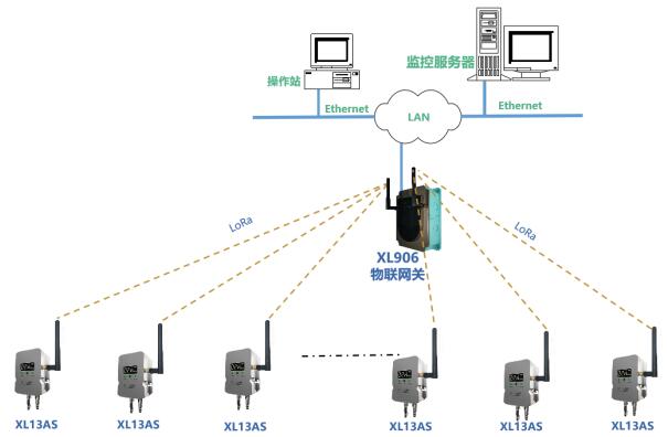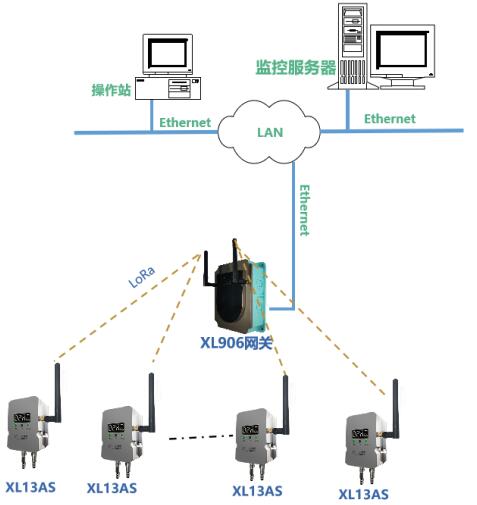 方案一:根據(jù)現(xiàn)場實際情況,部署XL906物聯(lián)網(wǎng)關(guān),XL13AS無線風(fēng)管風(fēng)速傳感器通過LoRa無線傳輸數(shù)據(jù)至XL906物聯(lián)網(wǎng)關(guān),網(wǎng)關(guān)可選Ethernet、Wi-Fi、4G等多種方式將風(fēng)速數(shù)據(jù)傳輸至監(jiān)控平臺。