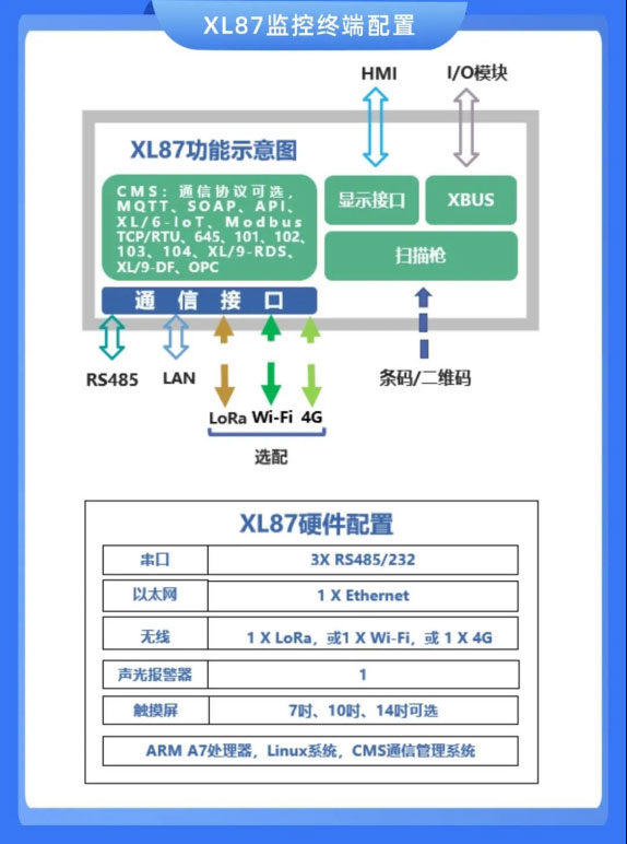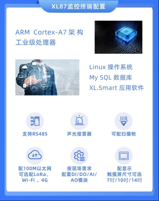 XL87監(jiān)控終端,以一套生產(chǎn)設備、一條產(chǎn)線、或是多臺相關聯(lián)的機器設備作為一個監(jiān)測對象,可實現(xiàn)設備數(shù)據(jù)采集、運行狀態(tài)監(jiān)測、物料追溯、設備信息讀取、機器啟停控制等功能。