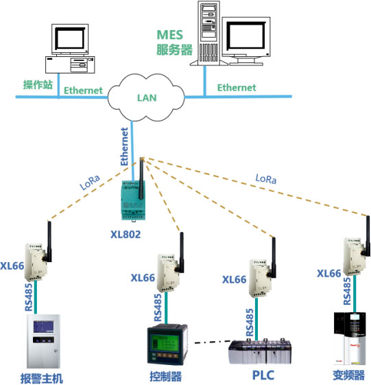 XL66無線轉換器通過RS485/RS232接口讀取設備數據,設計XL802通信主機安裝在LAN口附近接入局域網,并通過LoRa無線接口,從XL66無線讀取設備的運行數據,通信協(xié)議轉換處理后,通過Ethernet,轉發(fā)數據至MES。