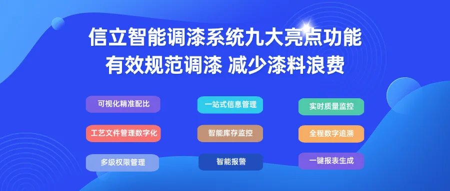 信立智能調(diào)漆系統(tǒng)XPMS,九大亮點(diǎn)功能設(shè)計(jì),逐一解決調(diào)漆過程固有問題,降低對(duì)人的依賴,減少漆料浪費(fèi),更準(zhǔn)確完整地計(jì)算統(tǒng)計(jì)漆料的使用及產(chǎn)出。
