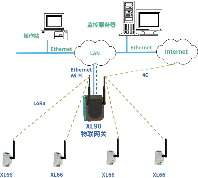 XL66串口無(wú)線轉(zhuǎn)換模塊通過(guò)LoRa將數(shù)據(jù)無(wú)線傳輸至XL90物聯(lián)網(wǎng)關(guān),網(wǎng)關(guān)通過(guò)以太網(wǎng)、Wi-Fi上傳數(shù)據(jù)至監(jiān)控平臺(tái)、PLC、觸摸屏、控制器等設(shè)備,或通過(guò)4G無(wú)線上傳數(shù)據(jù)至云平臺(tái)。