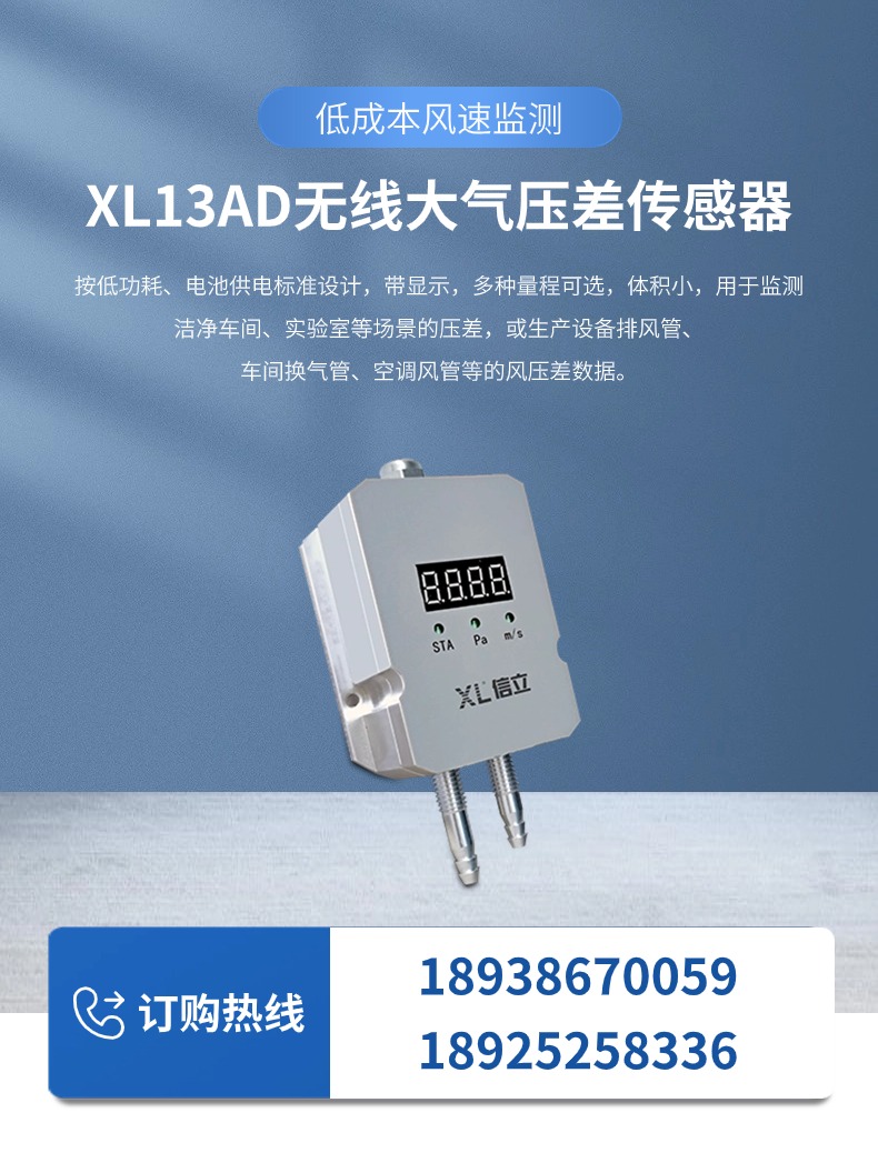 選用XL13AD無線壓差傳感器,部署于潔凈區邊界、動態風險點等關鍵點,實時監測壓差,并聯動回風管或排風管上的電動調節閥,當壓差異常時自動調節送/排風量。
